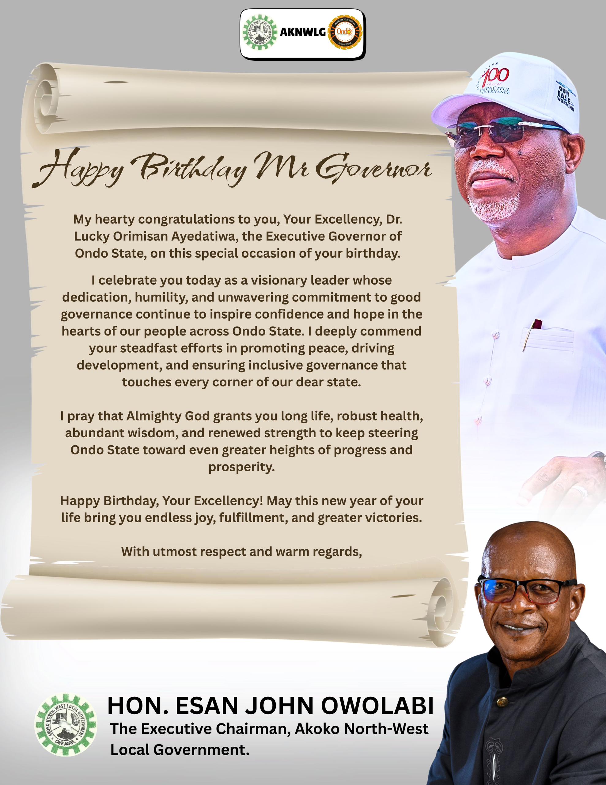 HEARTY CONGRATULATIONS TO GOVERNOR DR LUCKY AIYEDATIWA ON HIS BIRTHDAY ANNIVERSARY! -Chairman Owolabi Hon. Esan Owolabi, Executive Chairman of Akoko…