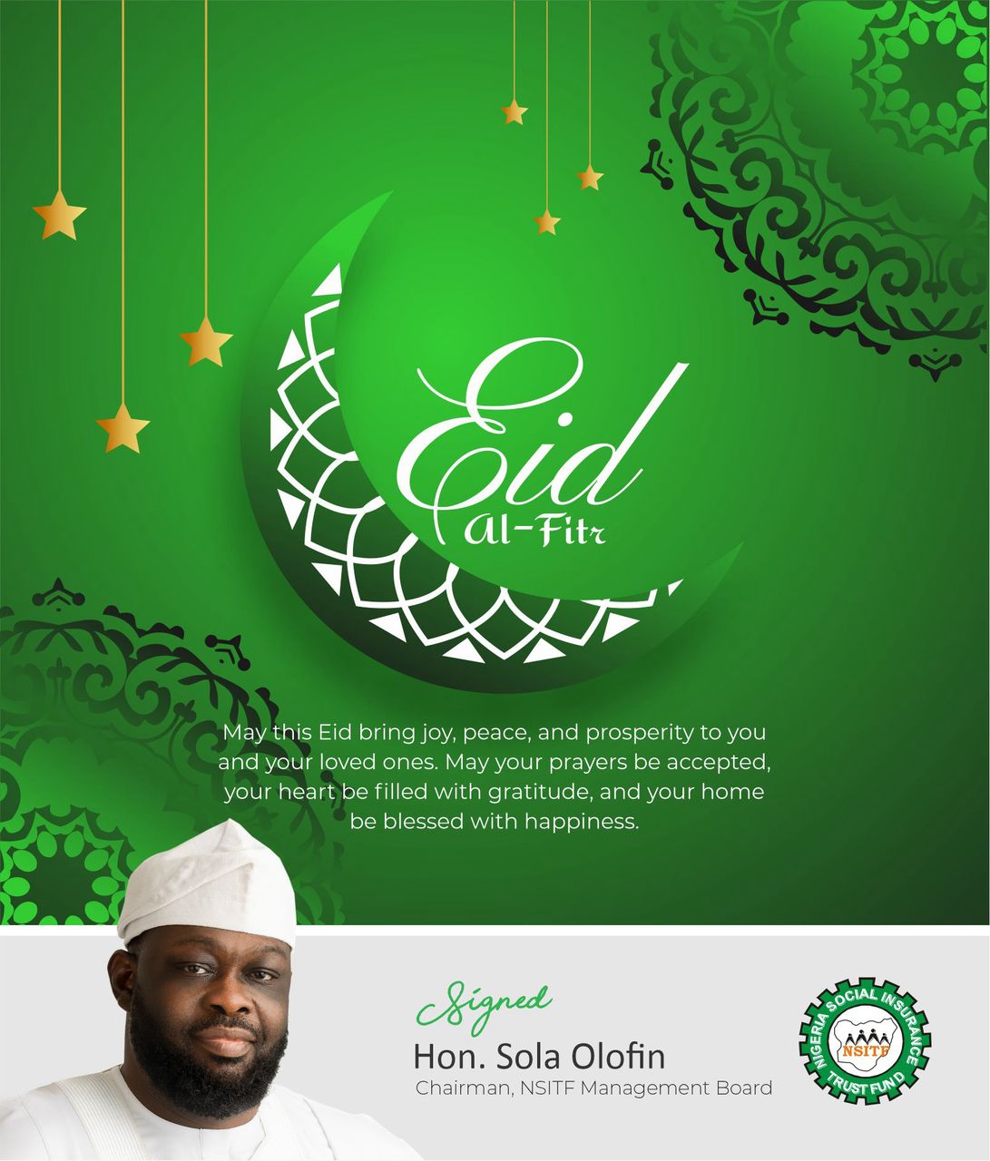 Sallah Wishes from Hon. Shola Olofin, Chairman, Nigeria Social Insurance Trust Fund (NSITF) On this auspicious occasion of the Sallah…