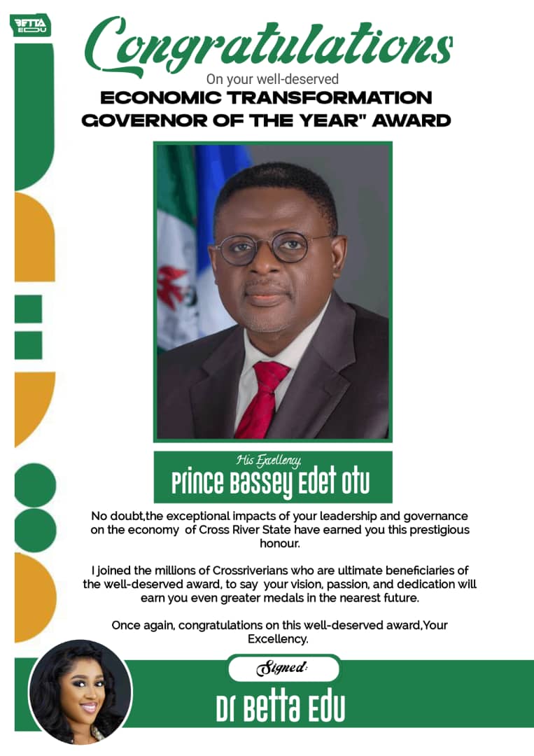 Your Excellency,My Governor, Senator Bassey Edet Otu, Congratulations on your well-deserved ” Economic Transformation Governor of the Year” award. No…