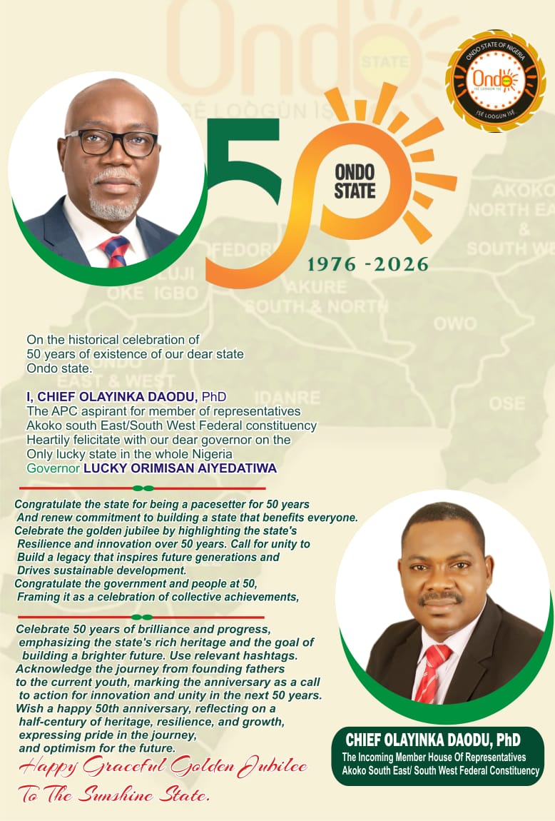 GOLDEN JUBILEE FELICITATION MESSAGE FROM CHIEF OLAYINKA DAODU,PhD APC ASPIRANT HOUSE OF REPRESENTATIVES AKOKO SOUTH EAST/SOUTH WEST FEDERAL CONSTITUENCY Chief…
