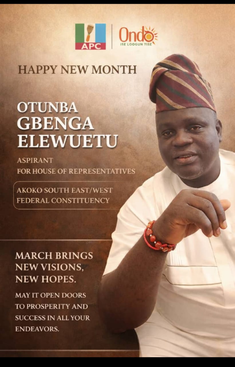 NEW MONTH, NEW CHAPTER: ELEWUETU GREETS THE GOOD PEOPLE OF AKOKO SOUTH FEDERAL CONSTITUENCY Otunba Gbenga Elewuetu, the leading aspirant…
