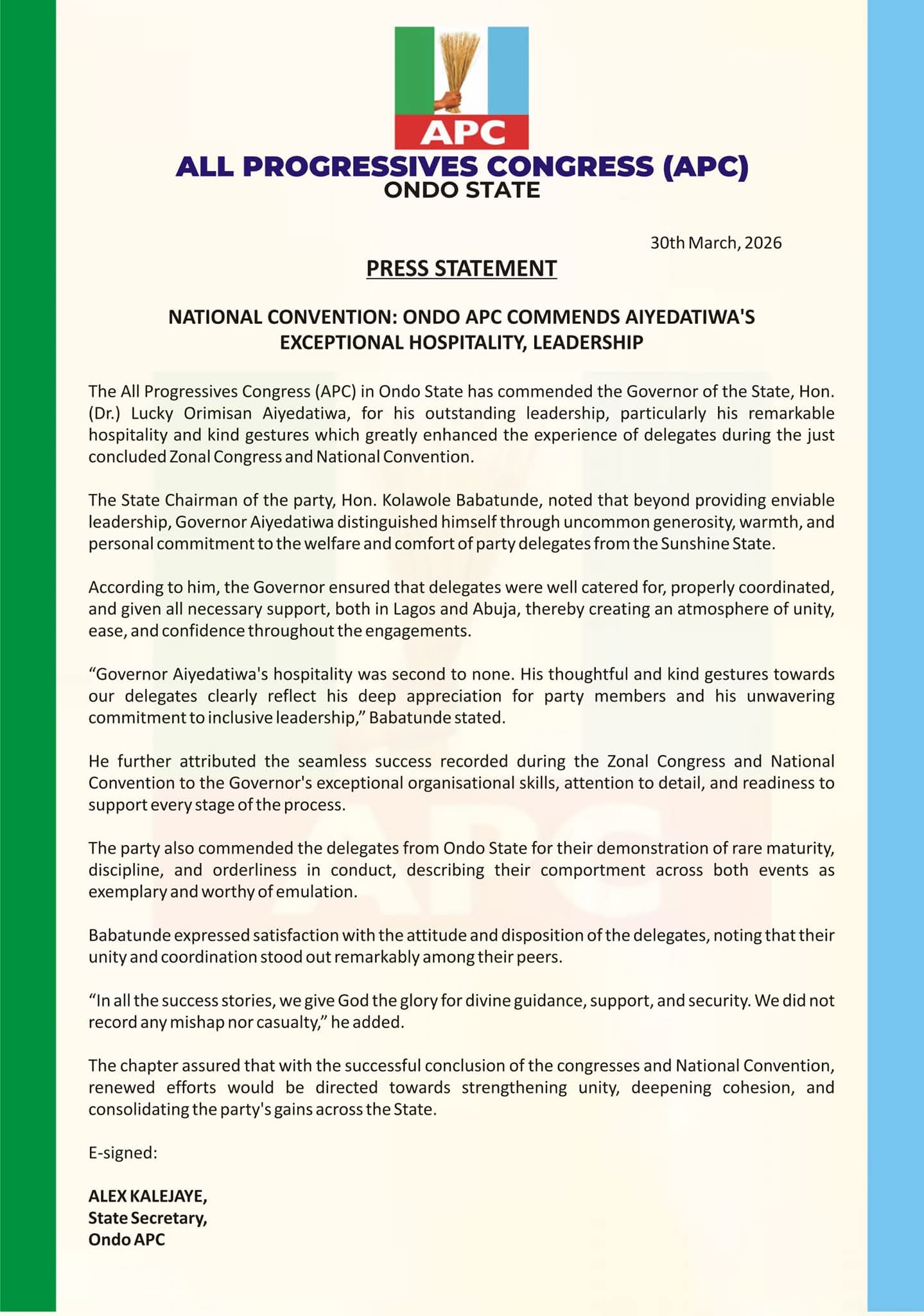 PRESS STATEMENT 30th March, 2026 National Convention: Ondo APC Commends Aiyedatiwa’s Exceptional Hospitality, Leadership The All Progressives Congress (APC) in…