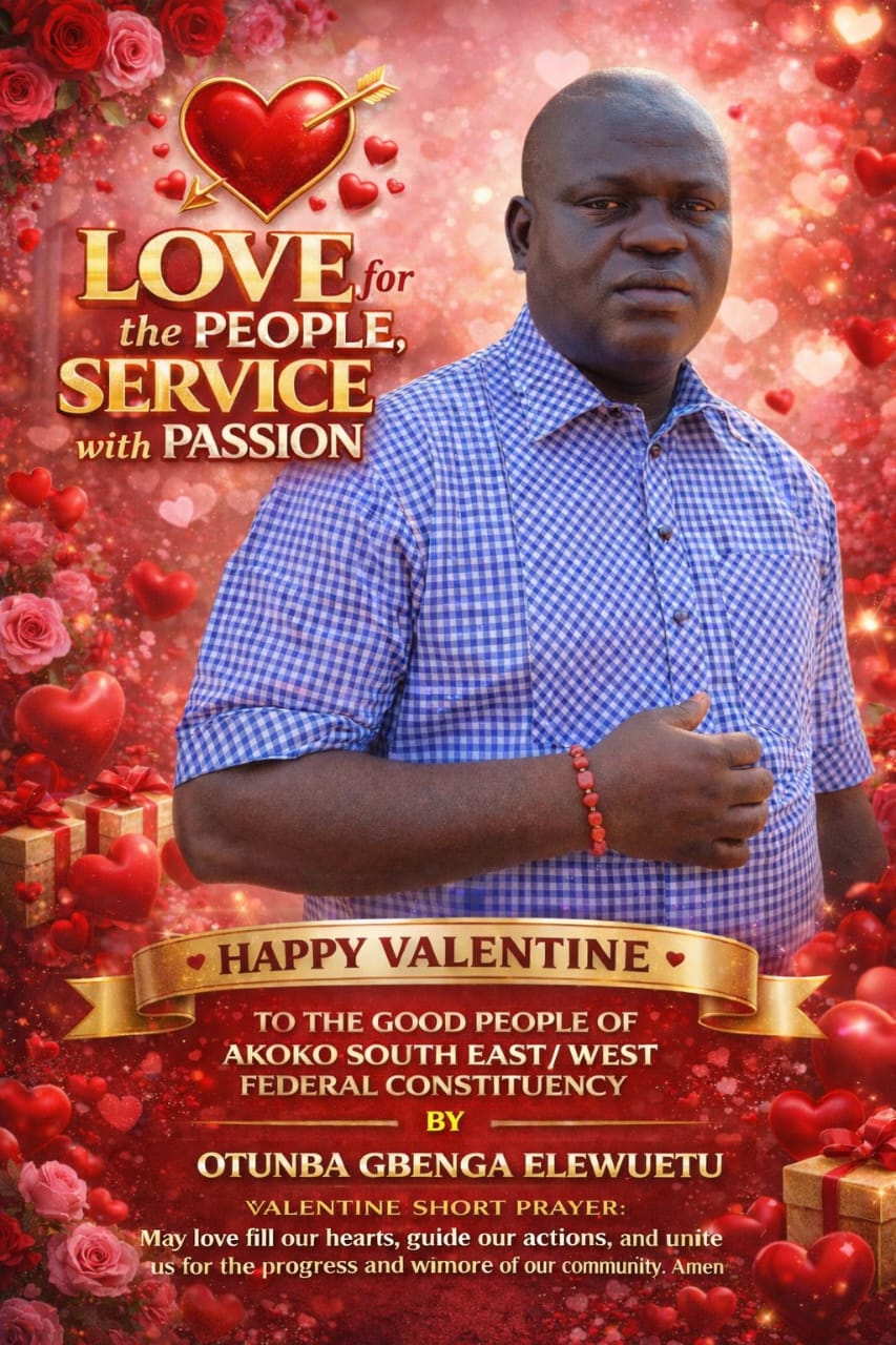 VALENTINE GREETINGS TO THE PEOPLE OF AKOKO SOUTH EAST/WEST FEDERAL CONSTITUENCY BY: OTUNBA GBENGA ELEWUETU “Dearest Constituents, colleagues, and well-wishers,…