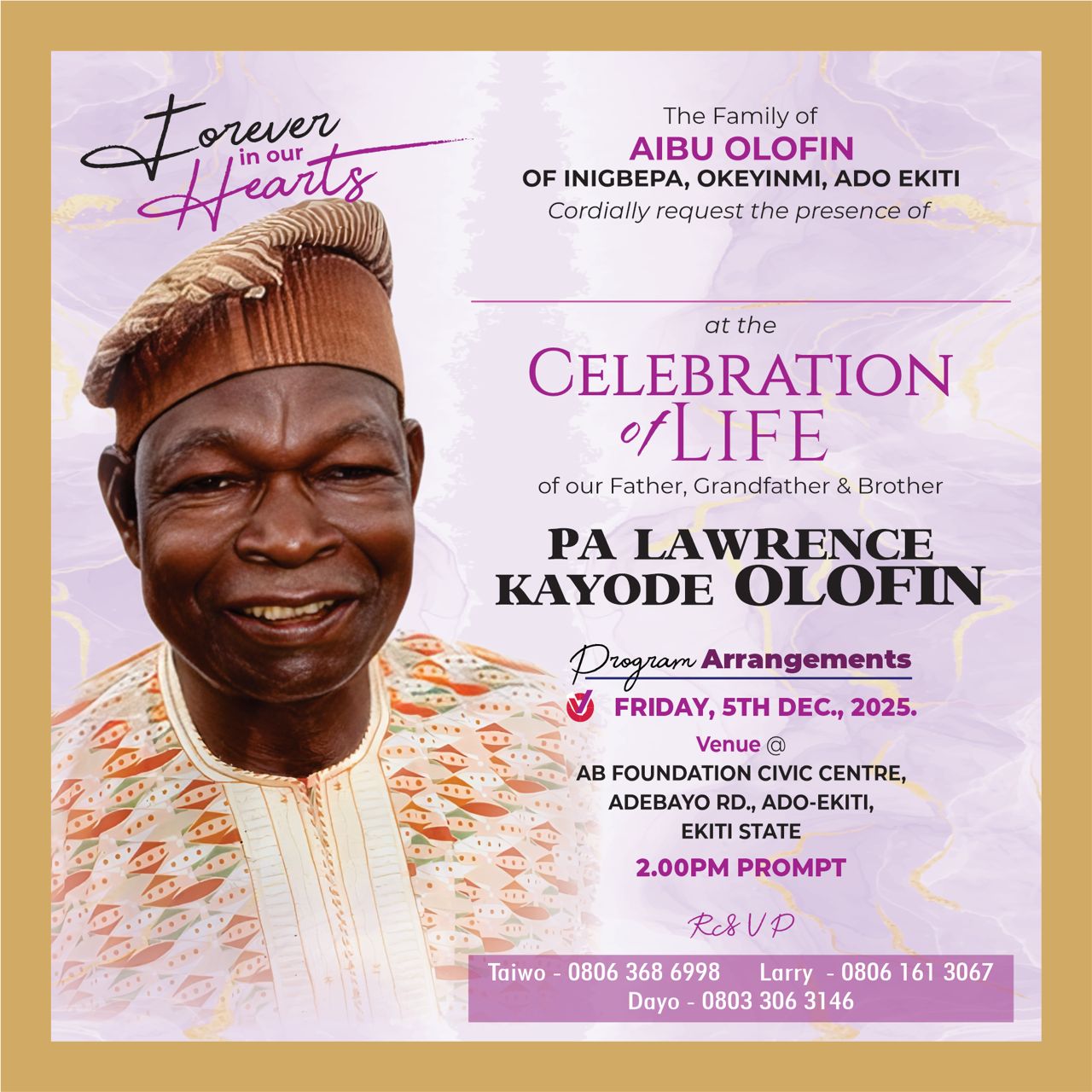 Special Invitation With gratitude to God for a life well lived, the Olofin Family warmly invites you to the Final…